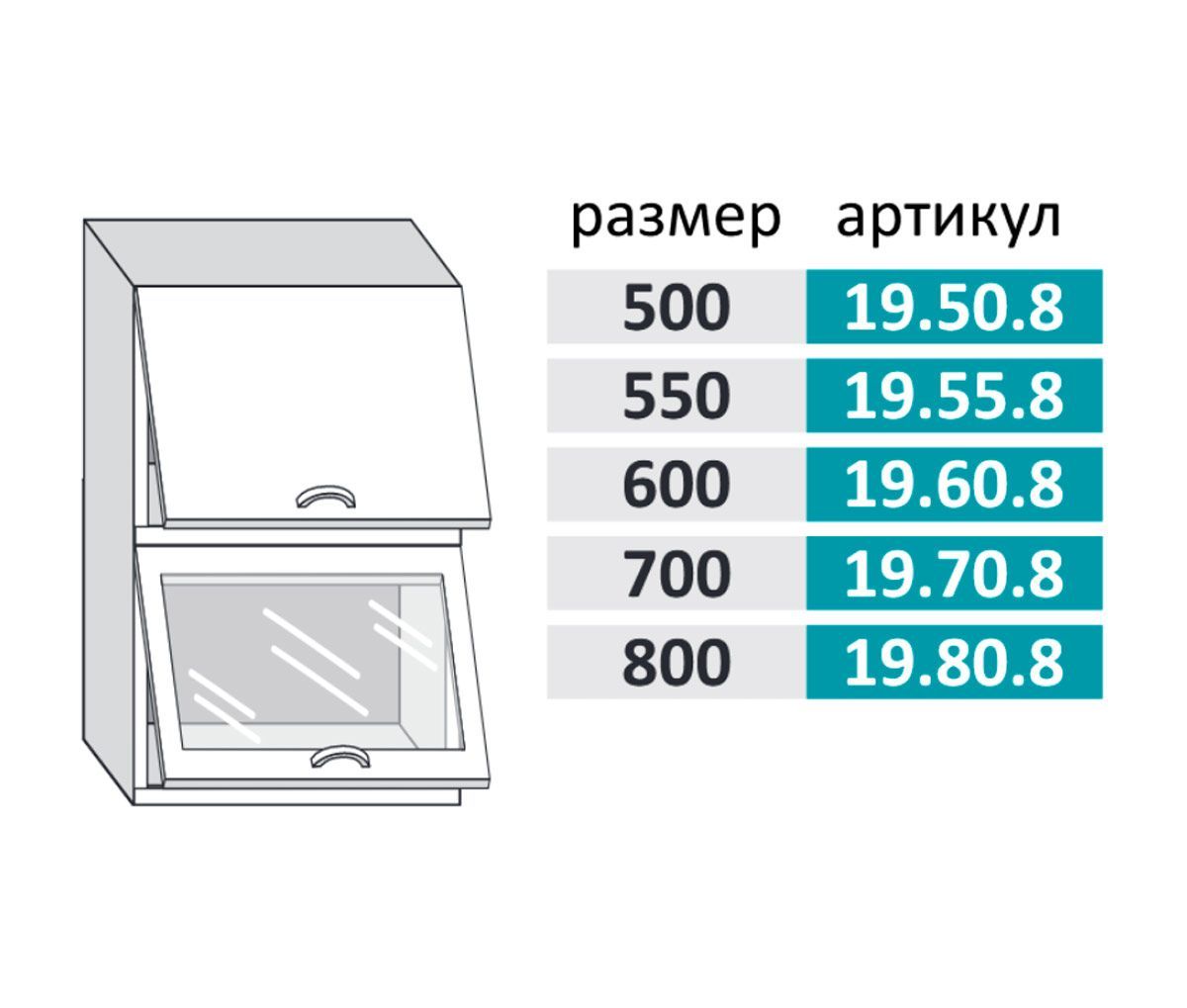 Имя для кухонного модуля: 19.55.8 Шкаф настенный (h=913) на 550мм с 2-мя горизонтальными дверцами, 1-ой стеклянной дверцей