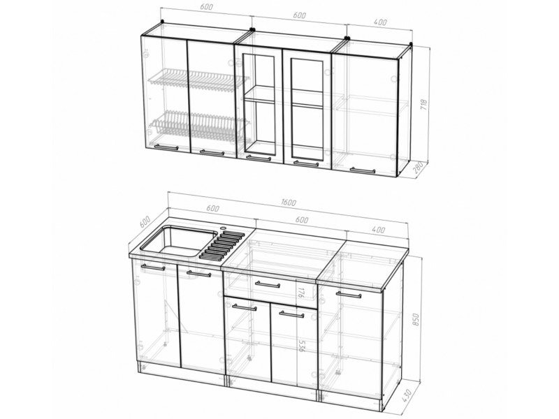 Внимание: стеновая панель, мойка, смеситель и посудосушители в комплекты гарнитура не входят.