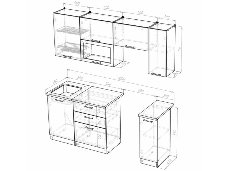 Внимание: стеновая панель, мойка, смеситель и посудосушители в комплекты гарнитура не входят.