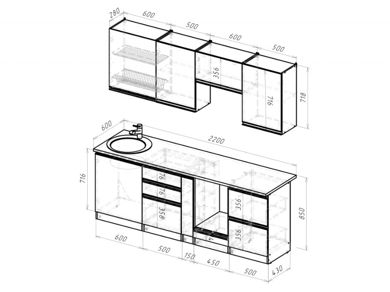 Внимание: стеновая панель, мойка, смеситель и посудосушители в комплекты гарнитура не входят.