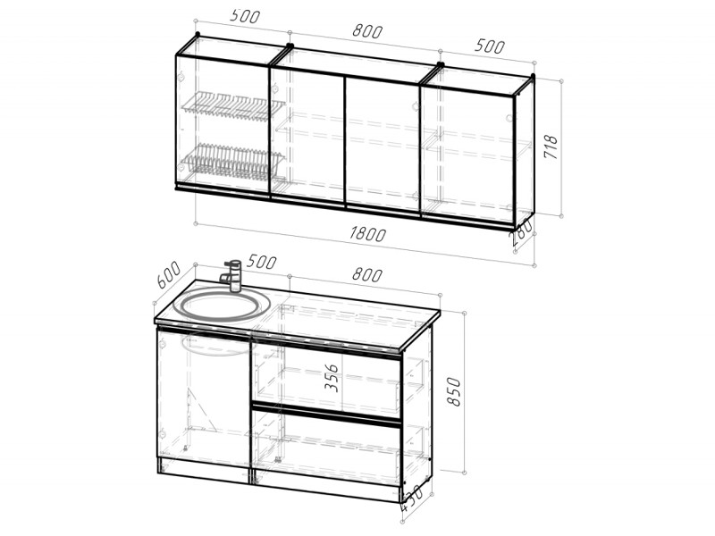 Внимание: стеновая панель, мойка, смеситель и посудосушители в комплекты гарнитура не входят.