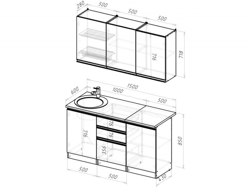 Внимание: стеновая панель, мойка, смеситель и посудосушители в комплекты гарнитура не входят.