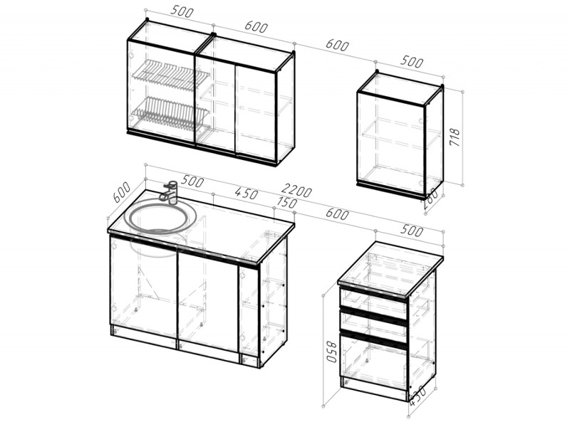 Внимание: стеновая панель, мойка, смеситель и посудосушители в комплекты гарнитура не входят.