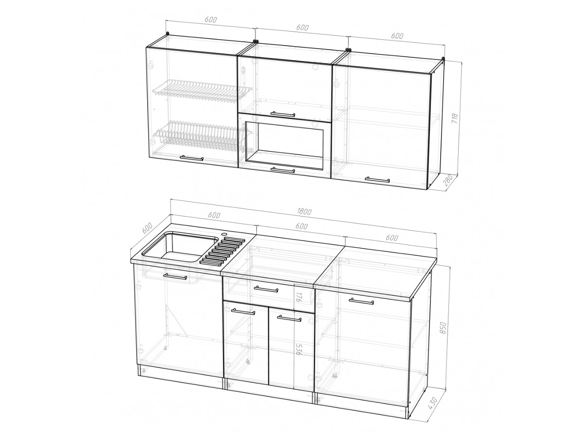 Внимание: стеновая панель, мойка, смеситель и посудосушители в комплекты гарнитура не входят.