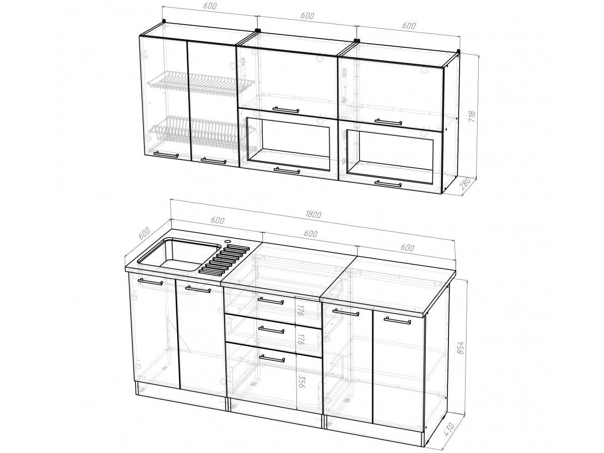 Внимание: стеновая панель, мойка, смеситель и посудосушители в комплекты гарнитура не входят.
