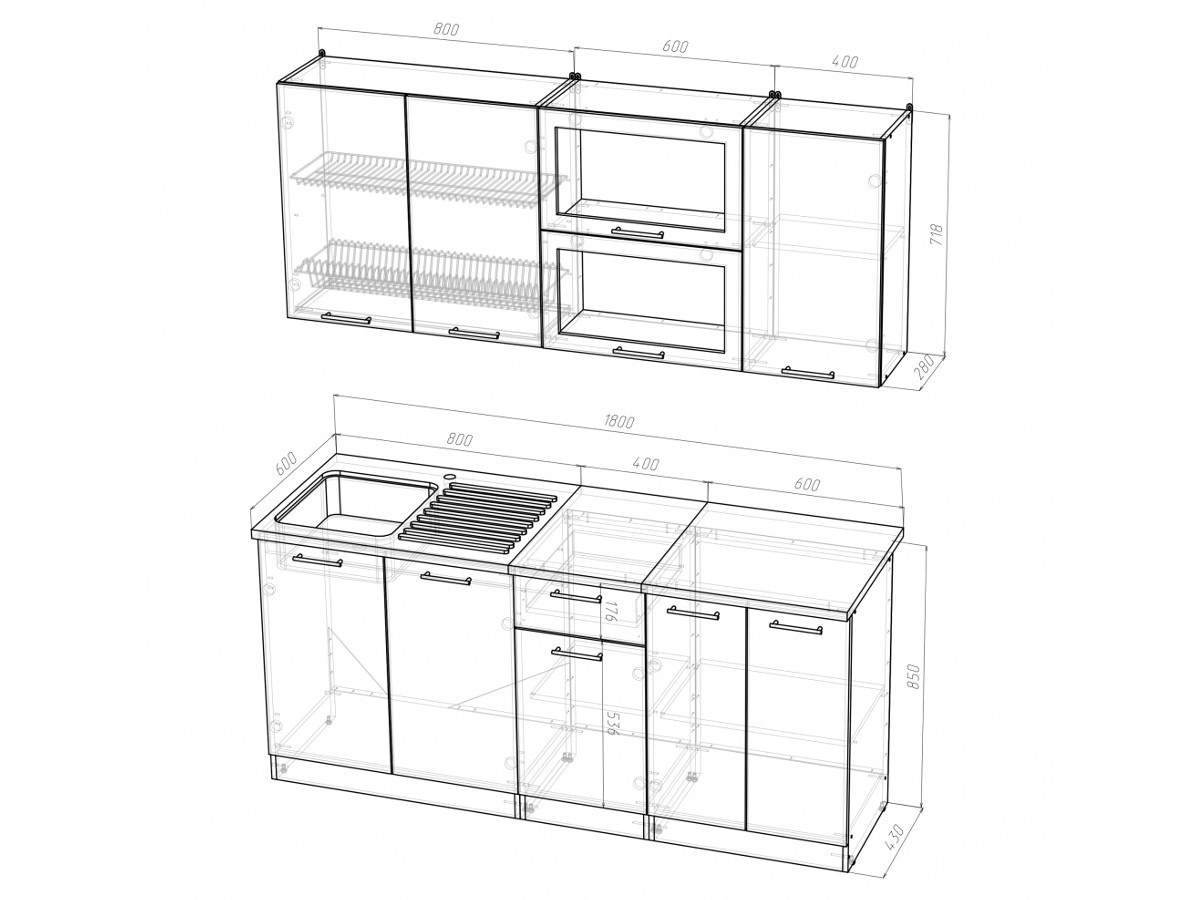 Внимание: стеновая панель, мойка, смеситель и посудосушители в комплекты гарнитура не входят.