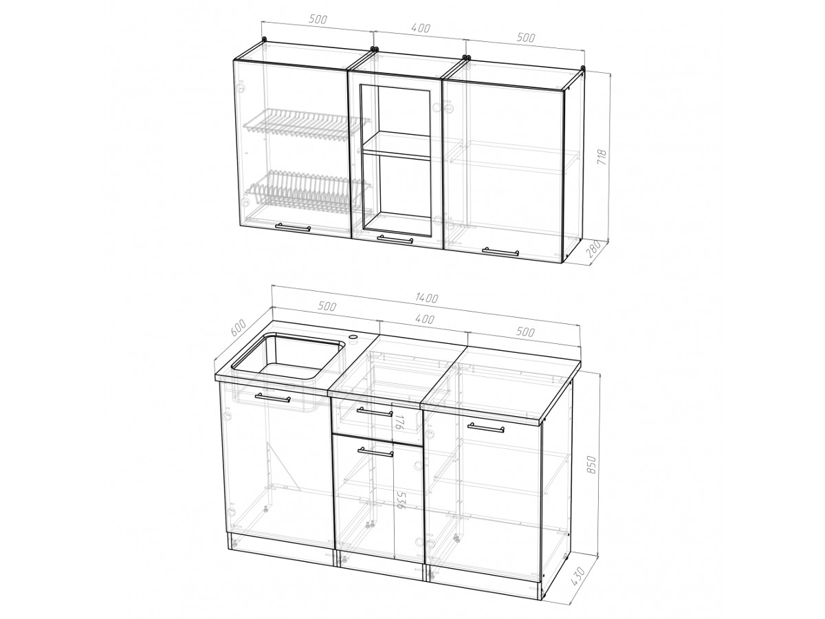 Внимание: стеновая панель, мойка, смеситель и посудосушители в комплекты гарнитура не входят.