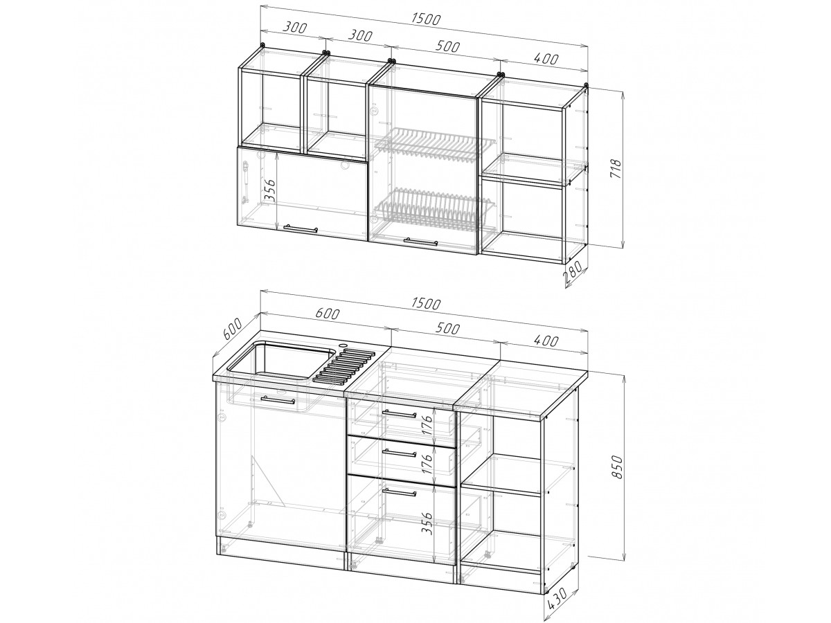 Внимание: стеновая панель, мойка, смеситель и посудосушители в комплекты гарнитура не входят.