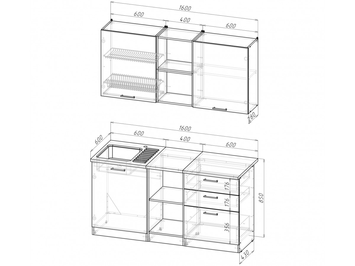 Внимание: стеновая панель, мойка, смеситель и посудосушители в комплекты гарнитура не входят.