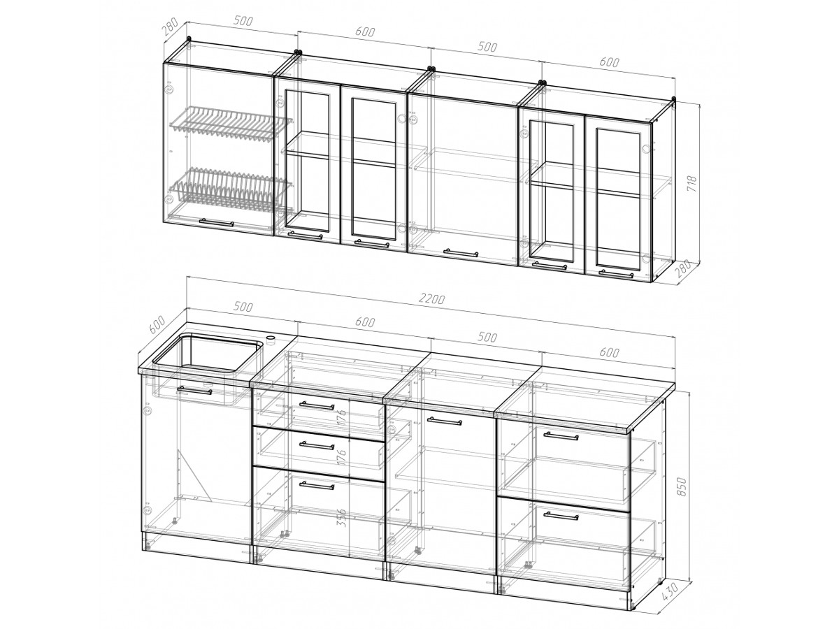 Внимание: стеновая панель, мойка, смеситель и посудосушители в комплекты гарнитура не входят.