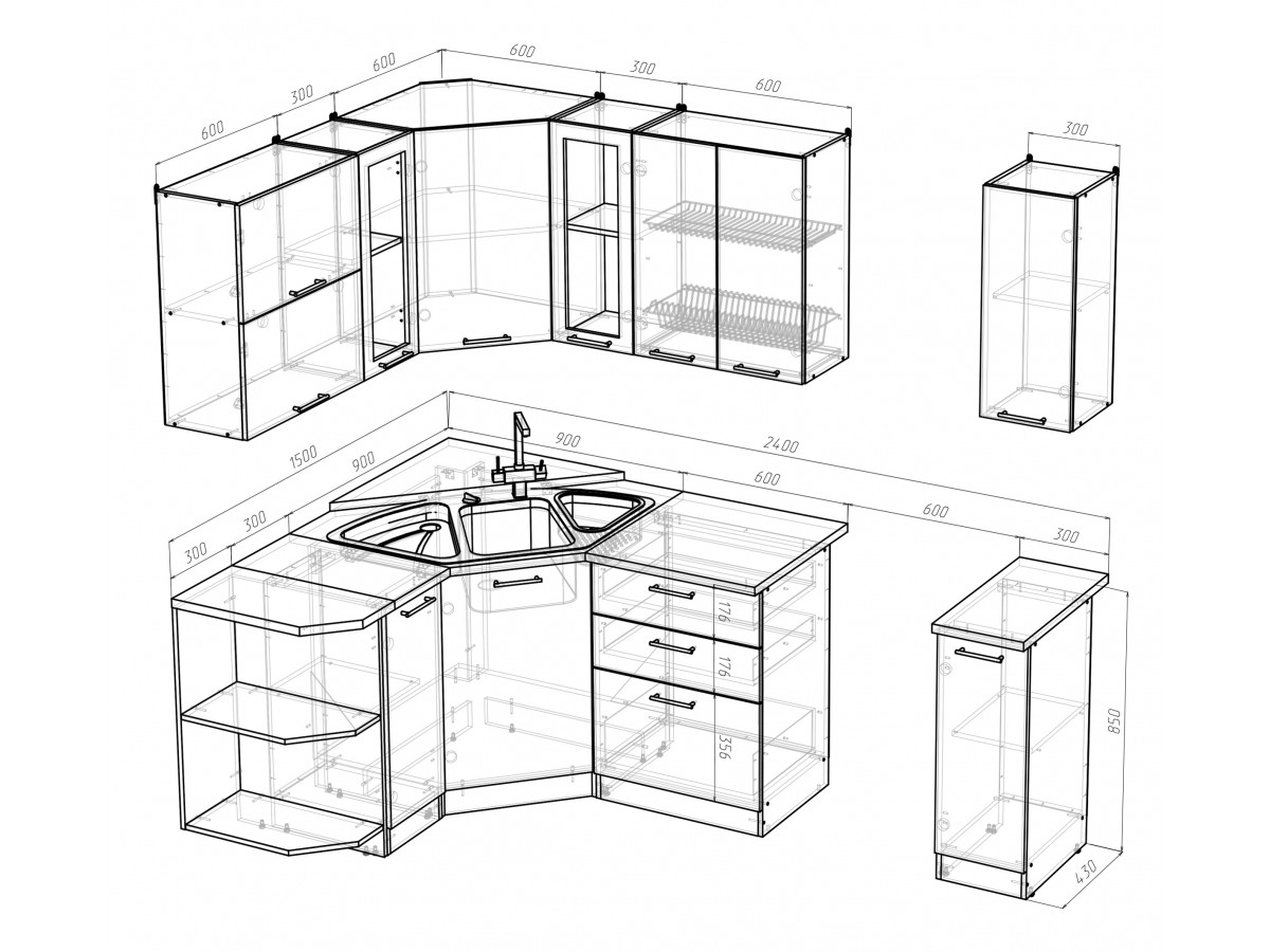 Внимание: стеновая панель, мойка, смеситель и посудосушители в комплекты гарнитура не входят.