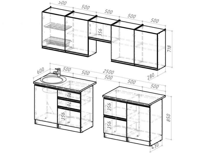 Внимание: стеновая панель, мойка, смеситель и посудосушители в комплекты гарнитура не входят.