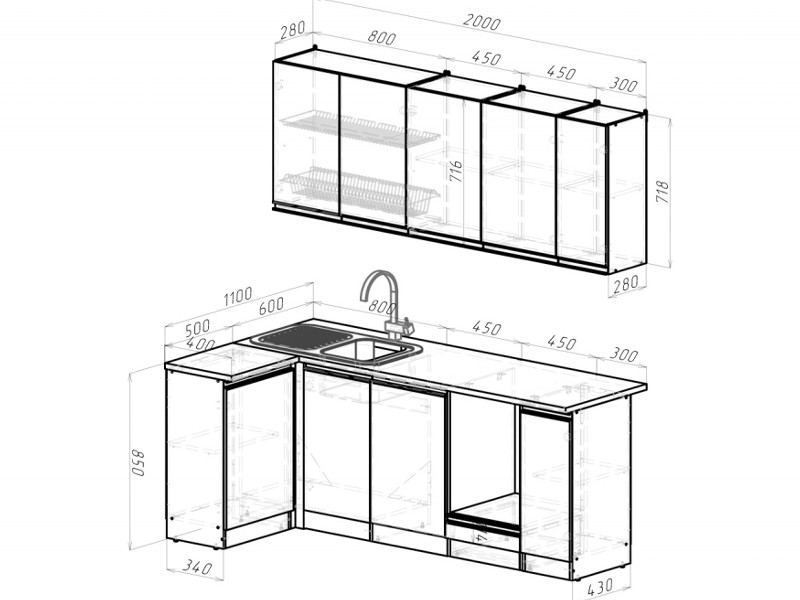 Внимание: стеновая панель, мойка, смеситель и посудосушители в комплекты гарнитура не входят.