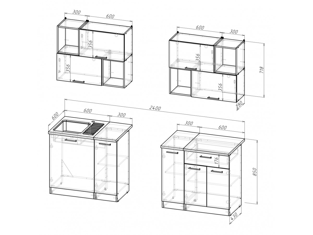 Внимание: стеновая панель, мойка, смеситель и посудосушители в комплекты гарнитура не входят.