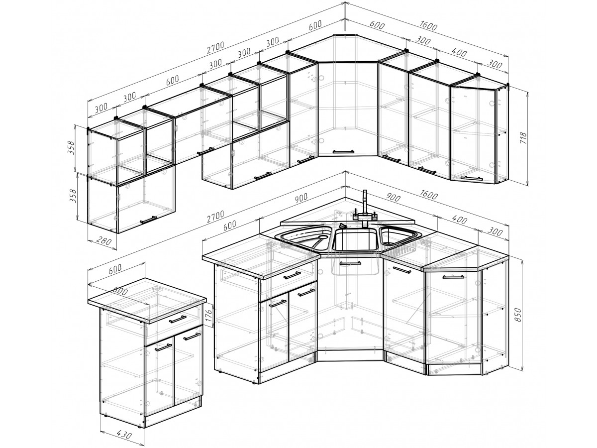 Внимание: стеновая панель, мойка, смеситель и посудосушители в комплекты гарнитура не входят.