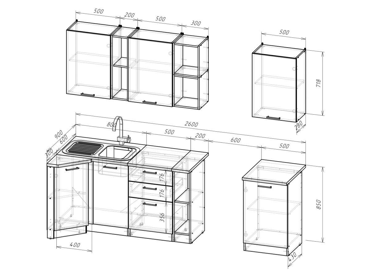 Внимание: стеновая панель, мойка, смеситель и посудосушители в комплекты гарнитура не входят.