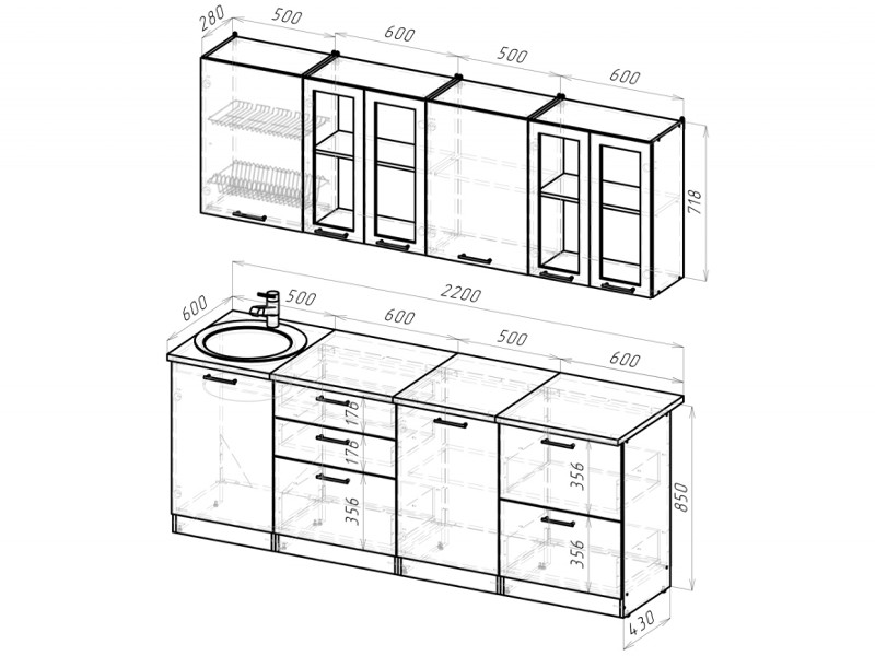 Внимание: стеновая панель, мойка, смеситель и посудосушители в комплекты гарнитура не входят.