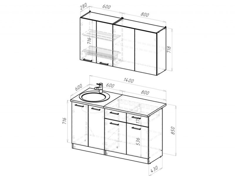 Внимание: стеновая панель, мойка, смеситель и посудосушители в комплекты гарнитура не входят.
