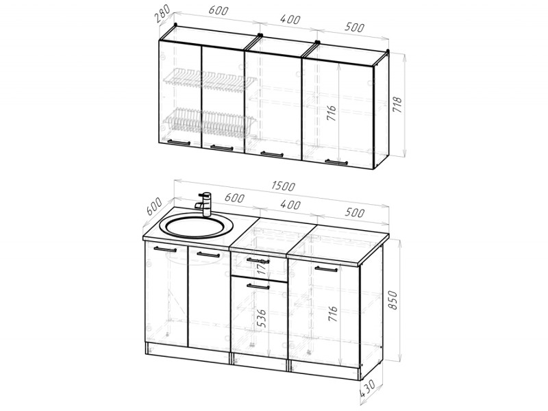 Внимание: стеновая панель, мойка, смеситель и посудосушители в комплекты гарнитура не входят.