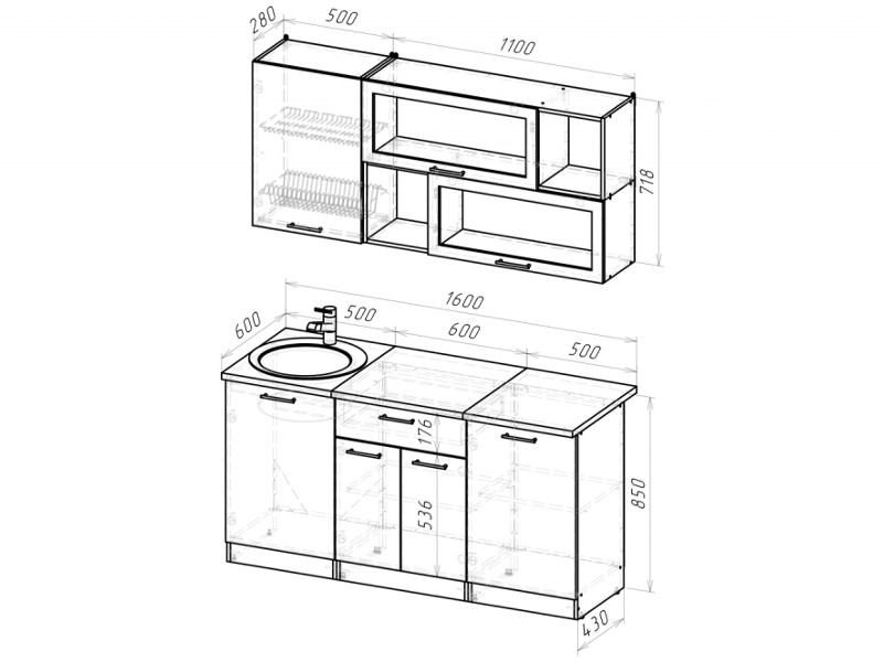 Внимание: стеновая панель, мойка, смеситель и посудосушители в комплекты гарнитура не входят.