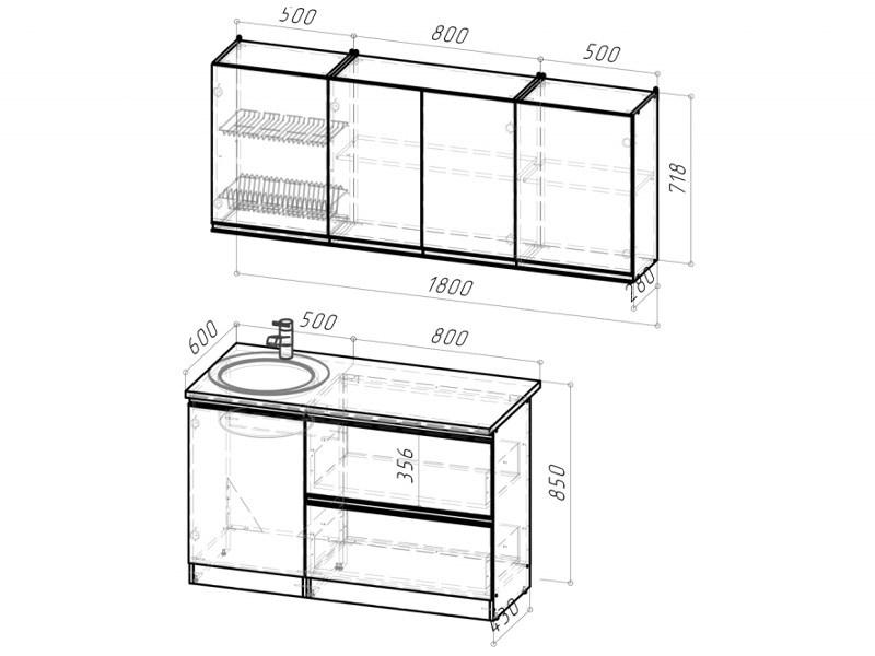 Внимание: стеновая панель, мойка, смеситель и посудосушители в комплекты гарнитура не входят.