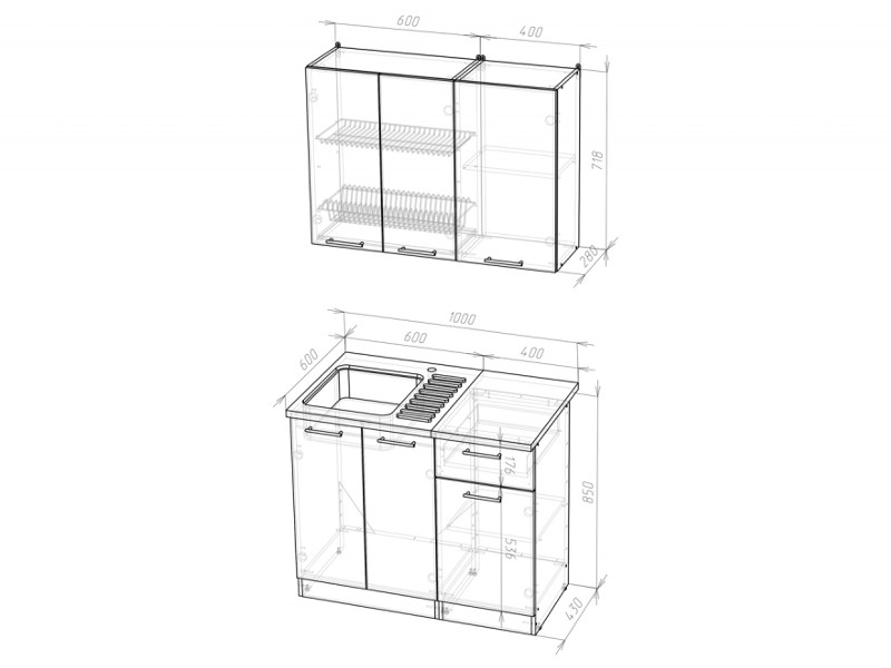 Внимание: стеновая панель, мойка, смеситель и посудосушители в комплекты гарнитура не входят.