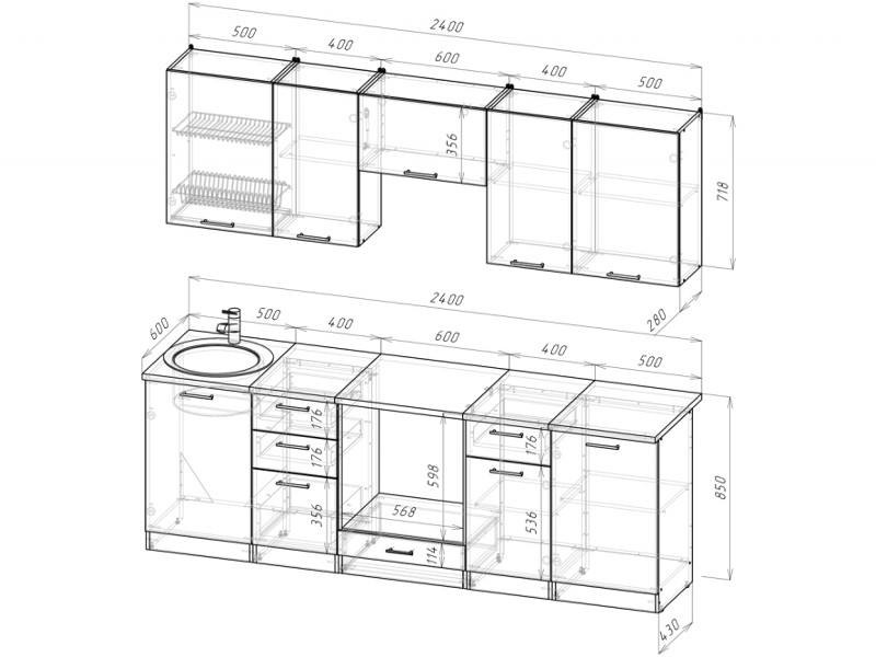 Внимание: стеновая панель, мойка, смеситель и посудосушители в комплекты гарнитура не входят.