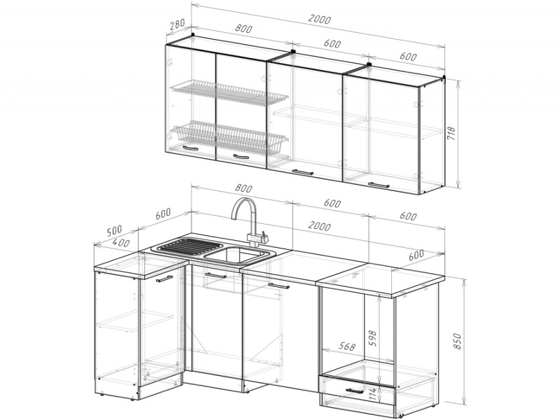 Внимание: стеновая панель, мойка, смеситель и посудосушители в комплекты гарнитура не входят.